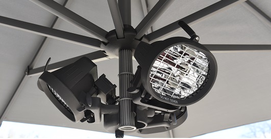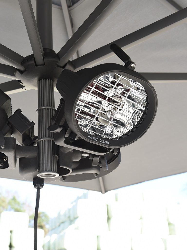 The halogen parasol heaters available for this model are composed by three lamps 500W each and a central fitting that attaches to the canopy frame, for heating a 360-degree area. The heat emitted from the short-wave lamps keeps people warm while relaxing in the garden or on the terrace. (*) Heaters are sold separately by phone order and not included in the initial package.