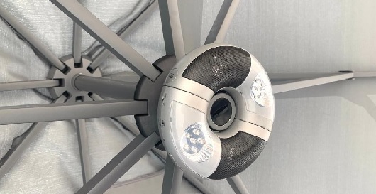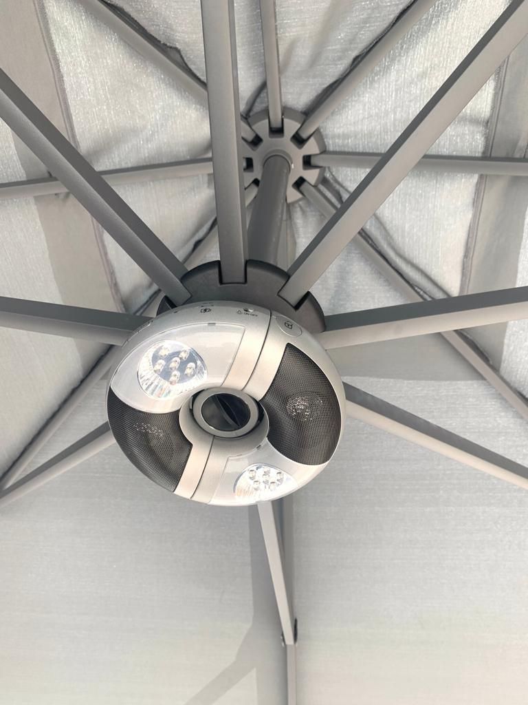 Stellar Aries cantilever parasol comes equipped with a ‘doughnut’ shaped speakers and LED lighting system. It has a USB rechargeable battery with over 6 hours autonomy so you can enjoy your favourite music playlist in style, if you connect to it via Bluetooth. It can be easily mounted in the middle of the canopy thanks to a clip-lock hinge.
